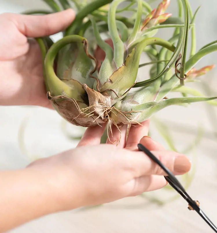 As your air plants grow, they'll develop new leaves and shed some old ones. Keep them looking neat by trimming any brown or dead leaves with scissors, and cutting at an angle for a natural appearance. Many air plants are shipped with roots that can be removed if you prefer.