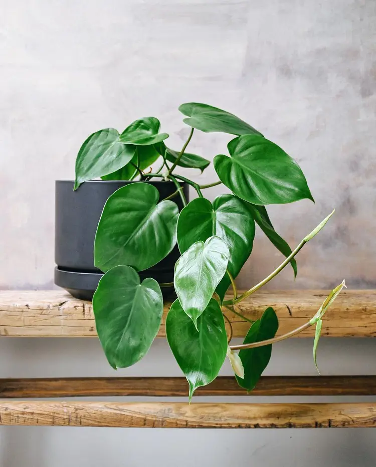 The heartleaf philodendron is a great indoor plant with shiny, heart-shaped leaves. You can hang them in baskets or let them climb on trellis. They thrive in medium, indirect light and need watering every 1-2 weeks.