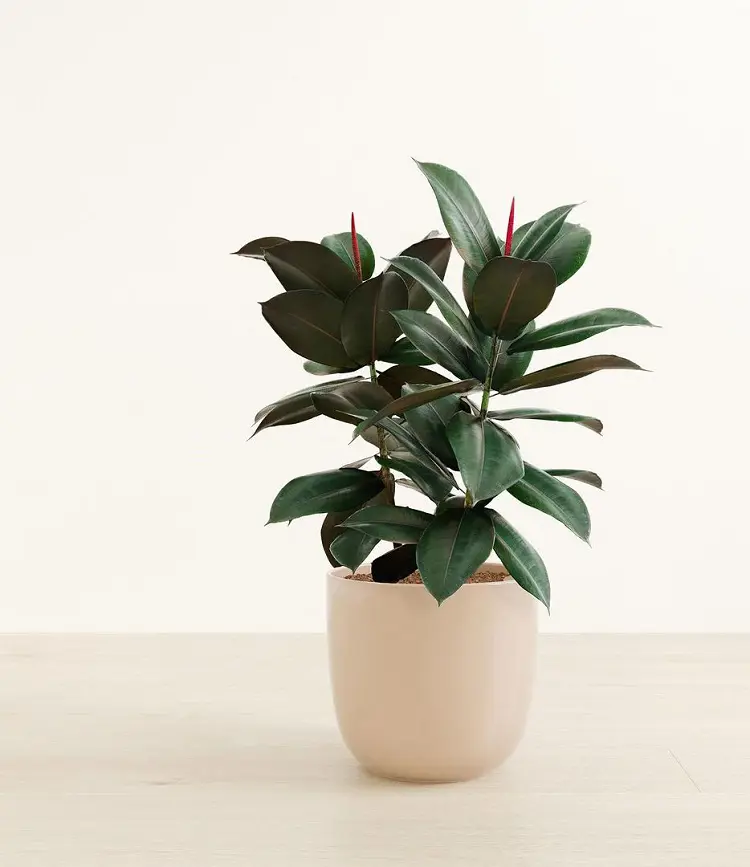 This easy-to-care rubber plant likes medium to bright indirect light. Water it every 1-2 weeks, letting the soil dry between waterings. Keep it away from very cold temperatures as it doesn't like it below 60 degrees.