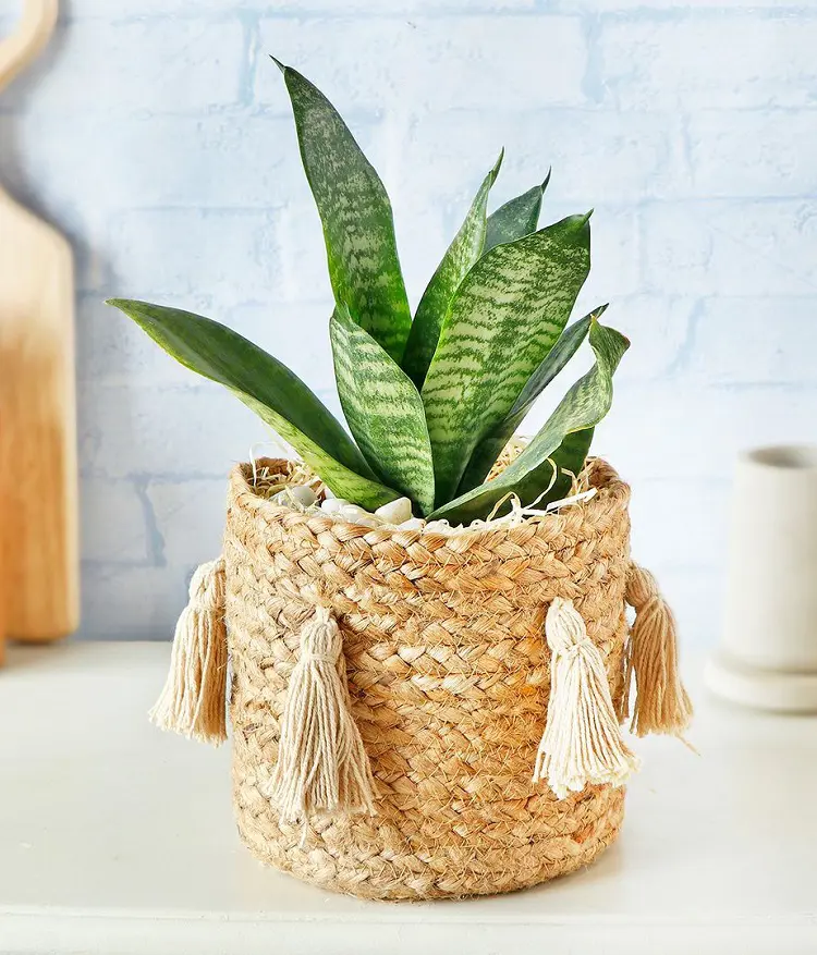 Water the Snake Plant only when the soil is dry, about every 3-4 weeks in warmer months. However, it's toxic to pets due to a substance called saponins, so households with cats or dogs should choose a different plant.
