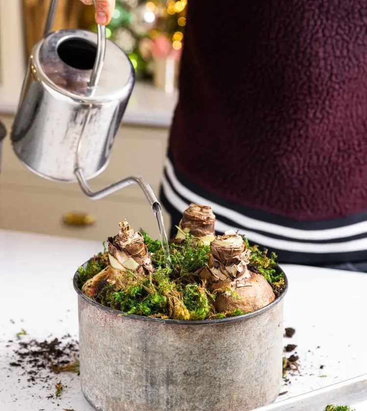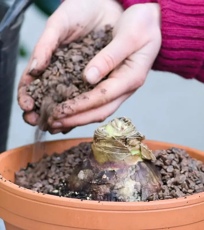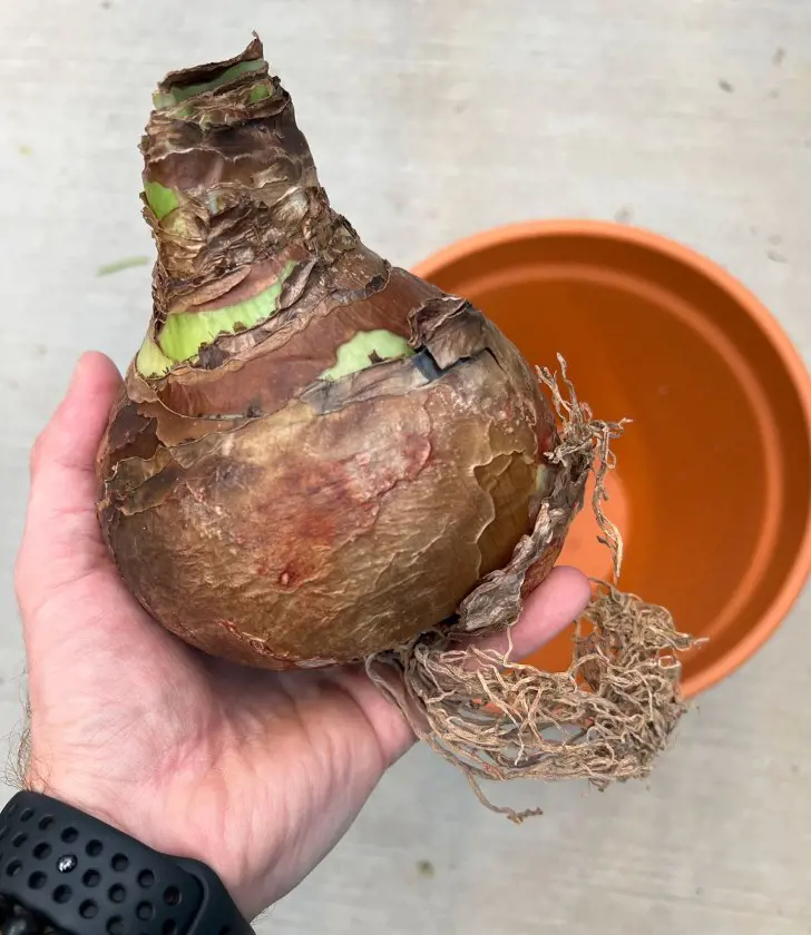 Prior to repotting, soak the bulb and its roots in a bowl of tepid water for a few hours. This helps rehydrate the roots and accelerates the growth process.