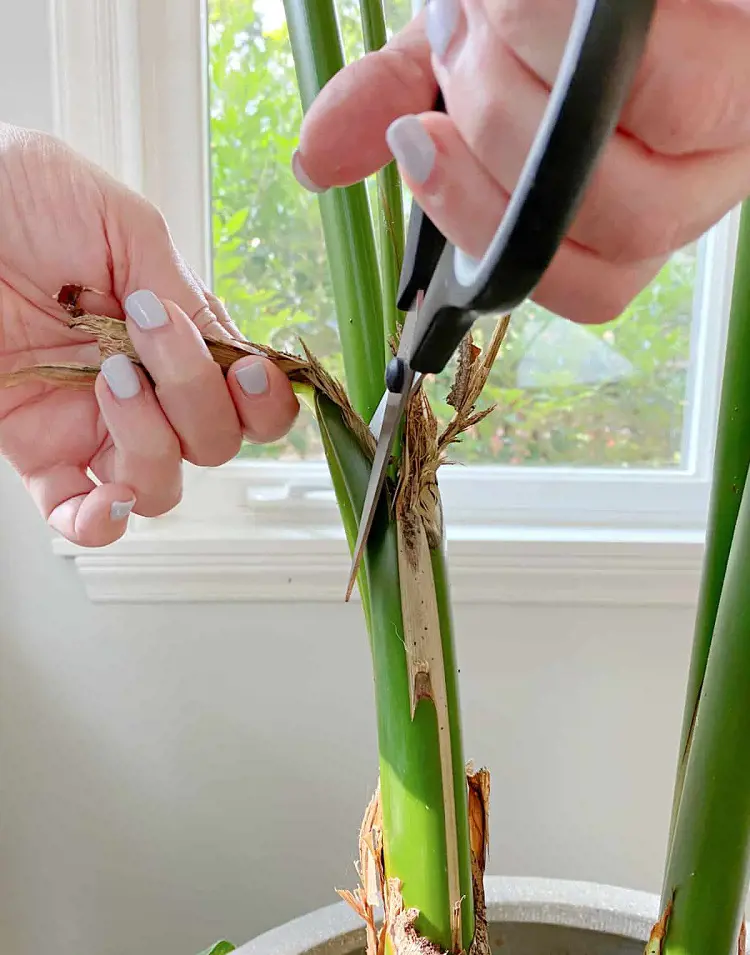 Trim the leaves at a slant, leaving the middle part a bit shorter. As time passes, the cut part will dry up, and you can easily pluck it away.