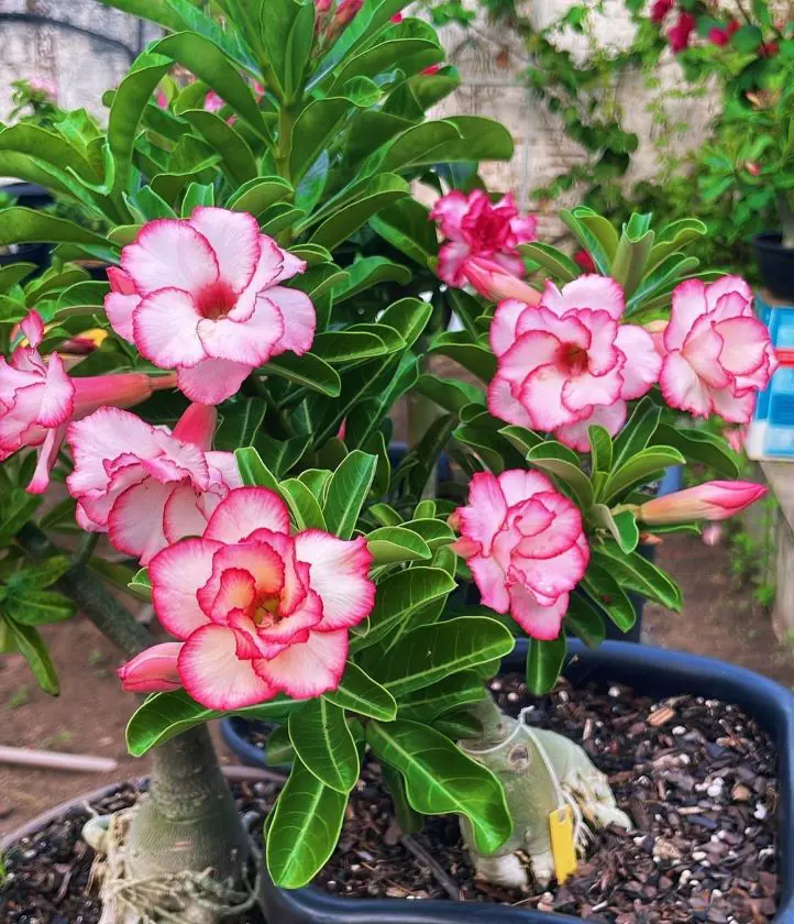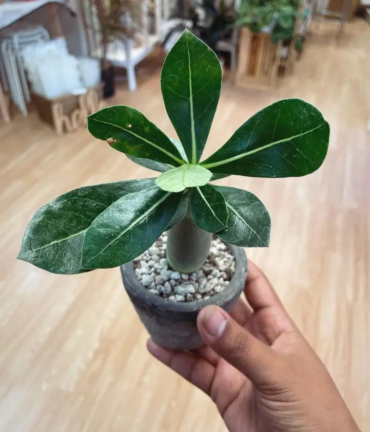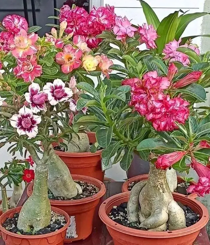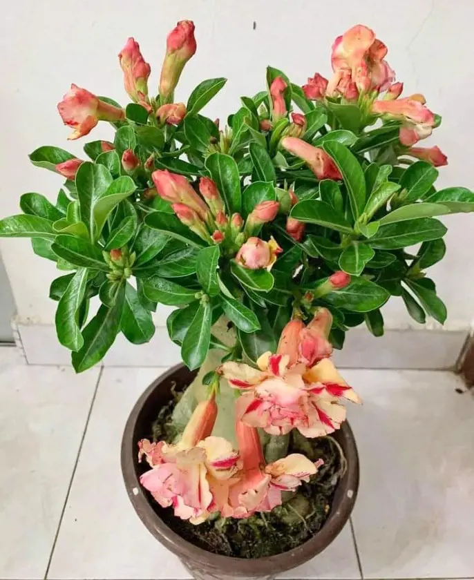 This is the most popular desert rose that boasts a plump, bulbous caudex resembling a miniature baobab tree. Its thick, fleshy leaves come in various shades of green and may exhibit variegation. During the blooming season, it produces clusters of stunning trumpet-shaped flowers in vibrant colors like red, pink, white, and even purple.