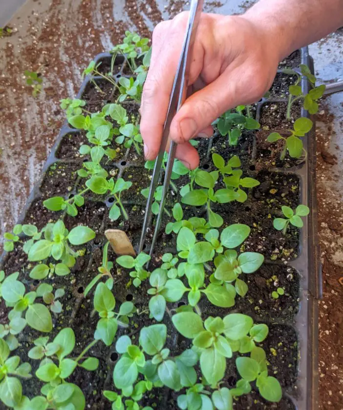 Seedlings should be at least 3 to 4 inches tall and have two pairs of true leaves before thinning. This process is best done while they are still young to avoid root disturbance.