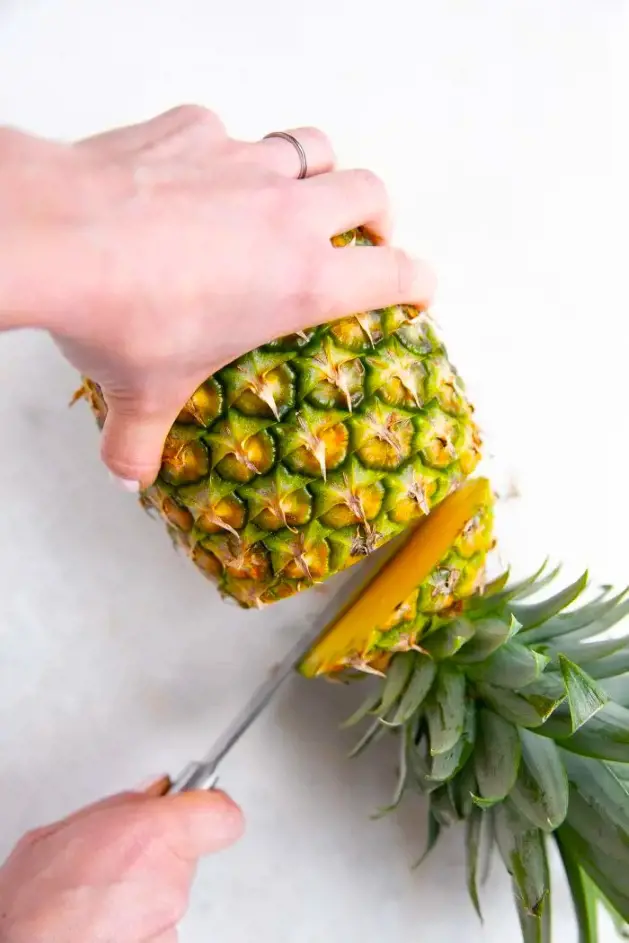 Carefully cut off the crown from the top of the pineapple, ensuring you leave about an inch of fruit attached to the base of the leaves.