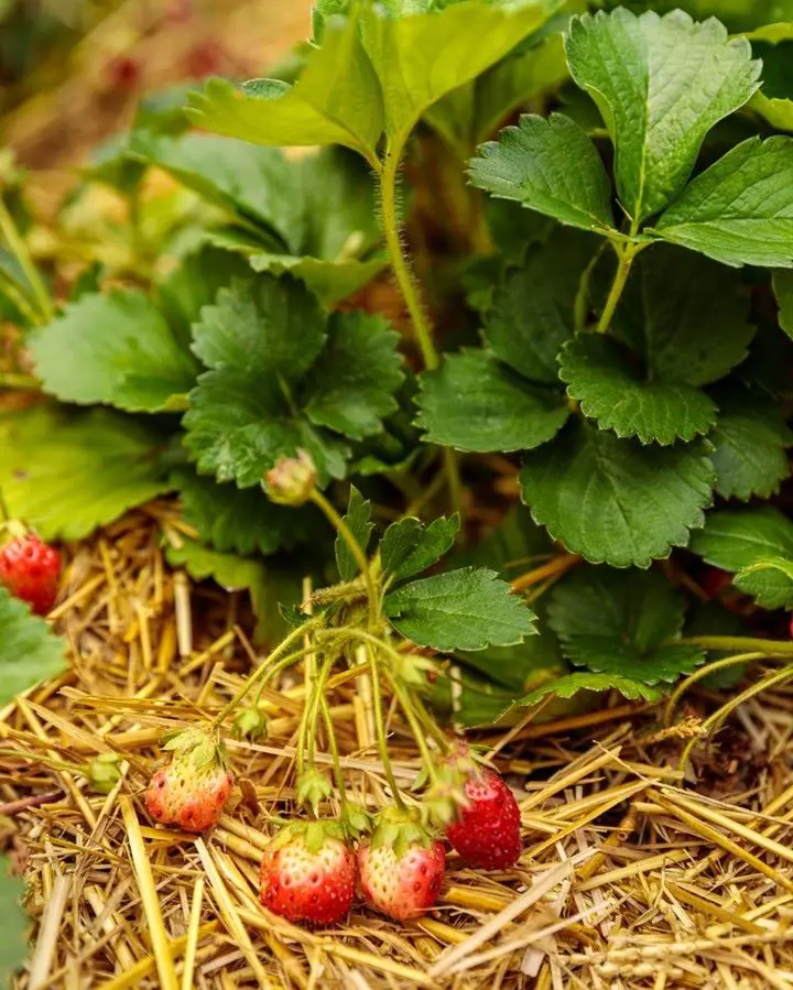 Mulching around strawberry plants is essential for moisture retention, weed suppression, and keeping the berries clean. Typically, a layer of straw or shredded leaves about 2 to 3 inches thick is used for this purpose. This practice also helps protect the plants' roots during cold winters and prevents soil splashing onto the fruit.