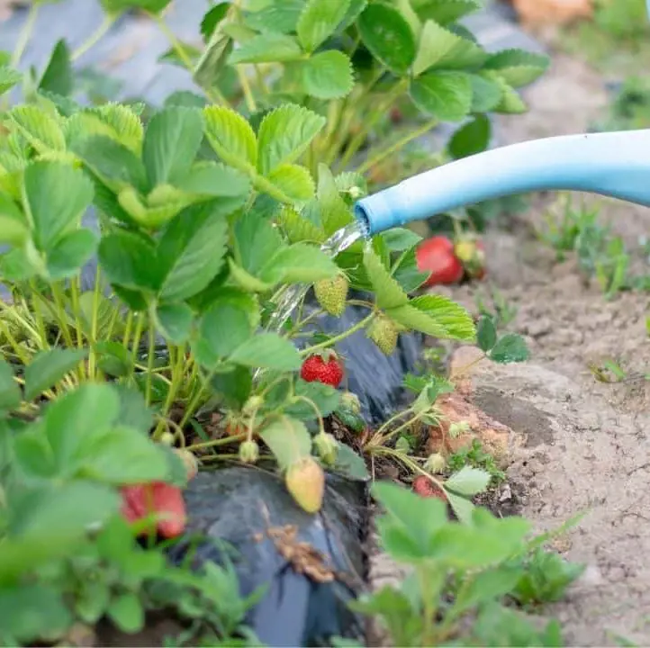 Water your strawberries deeply and evenly, providing about 1 inch of water per week. Just aim to soak the soil thoroughly without making it soggy. This can be achieved by using a watering can or a hose with a jet setting to pour water directly into the soil.