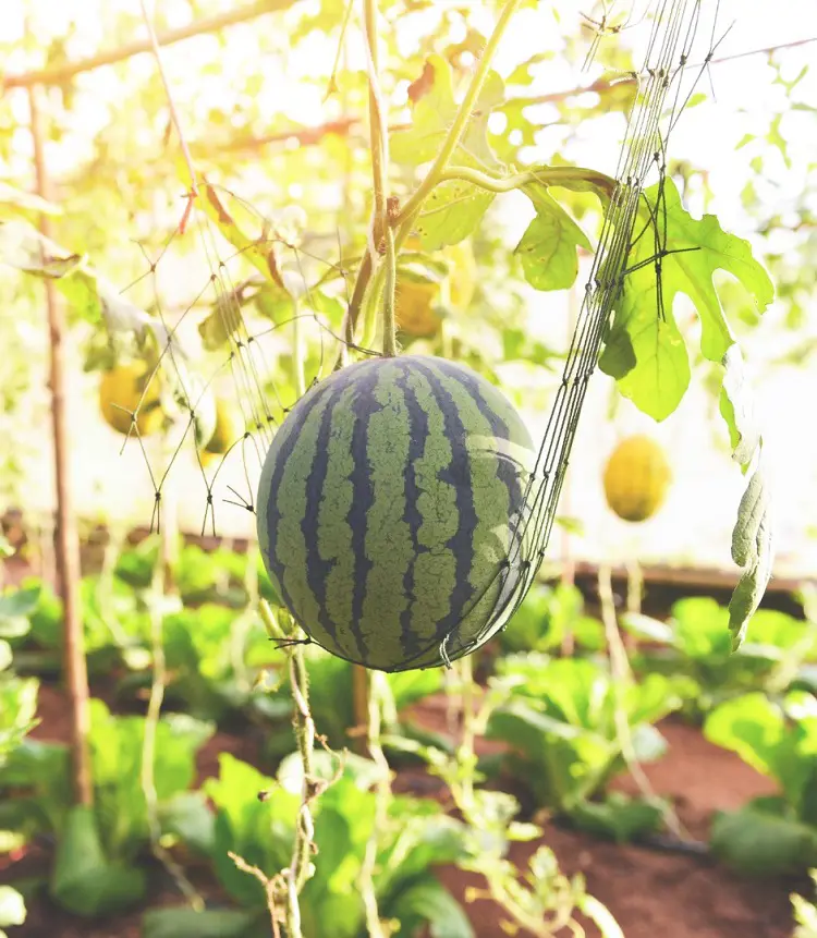 As the vine grows, assist it to crawl on a trellis or teepee. Once the fruit starts to grow, use soft fabric to create a small hammock for each melon. It is advisable to water it in the morning and in the evening when it is warm and during the day when it is hot.