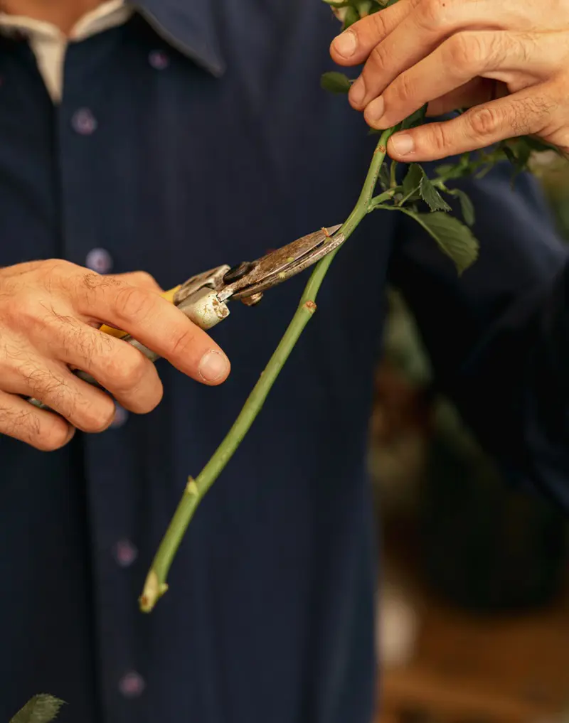 Be sure that every stem is at an angle when you cut them. A flat stem will sit flush with the bottom of a vase, meaning the stem won’t get the water it needs.