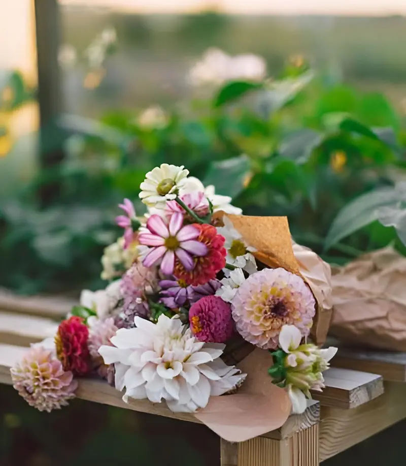 Choose the seasonal flowers that complement where the bouquet will be as well as the colors of the flowers within the bouquet.