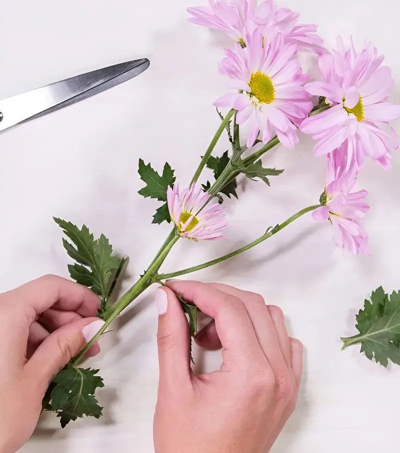 Next, once you have finished arranging the entire bouquet, complete with filler blooms and greenery. If you already haven't done so during the preparation stage, cut off all the leaves and any extra foliage near the part of the stem where you’ll be tying the bouquet.
