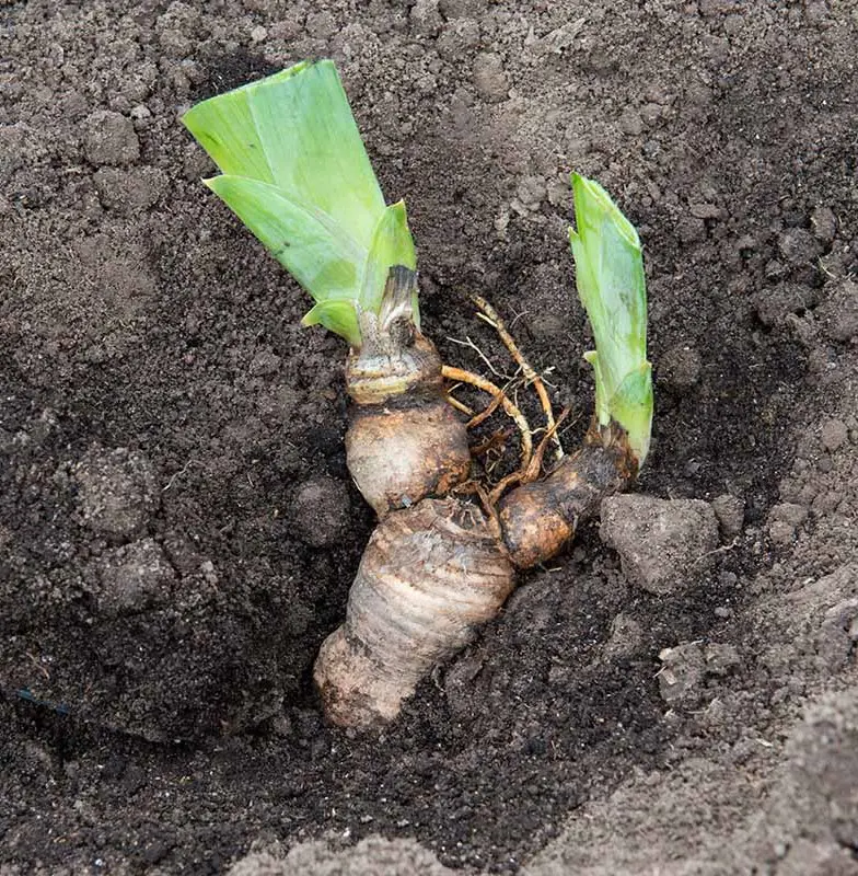 - Dig a hole about 4 inches deep and create a small soil mound in the center. Position the rhizome on top of the soil mound and firmly pack the soil around the roots.