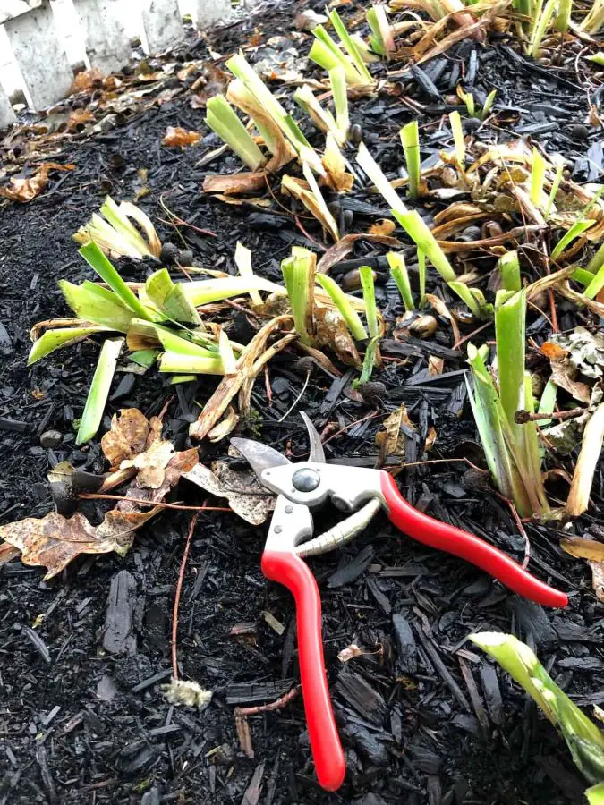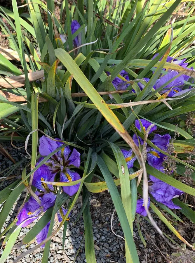 - Continue to monitor the iris plant throughout the growing season and prune any additional spent flower stems or yellowing leaves as needed.