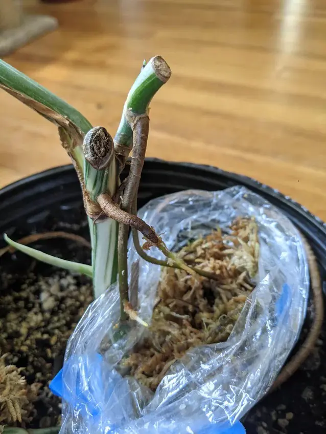 You can place the cutting in a well-draining medium, such as a mix of peat and perlite. Keep it moist and humid by covering it with a plastic bag. You may dip the cutting in the rooting hormone to enhance root development.