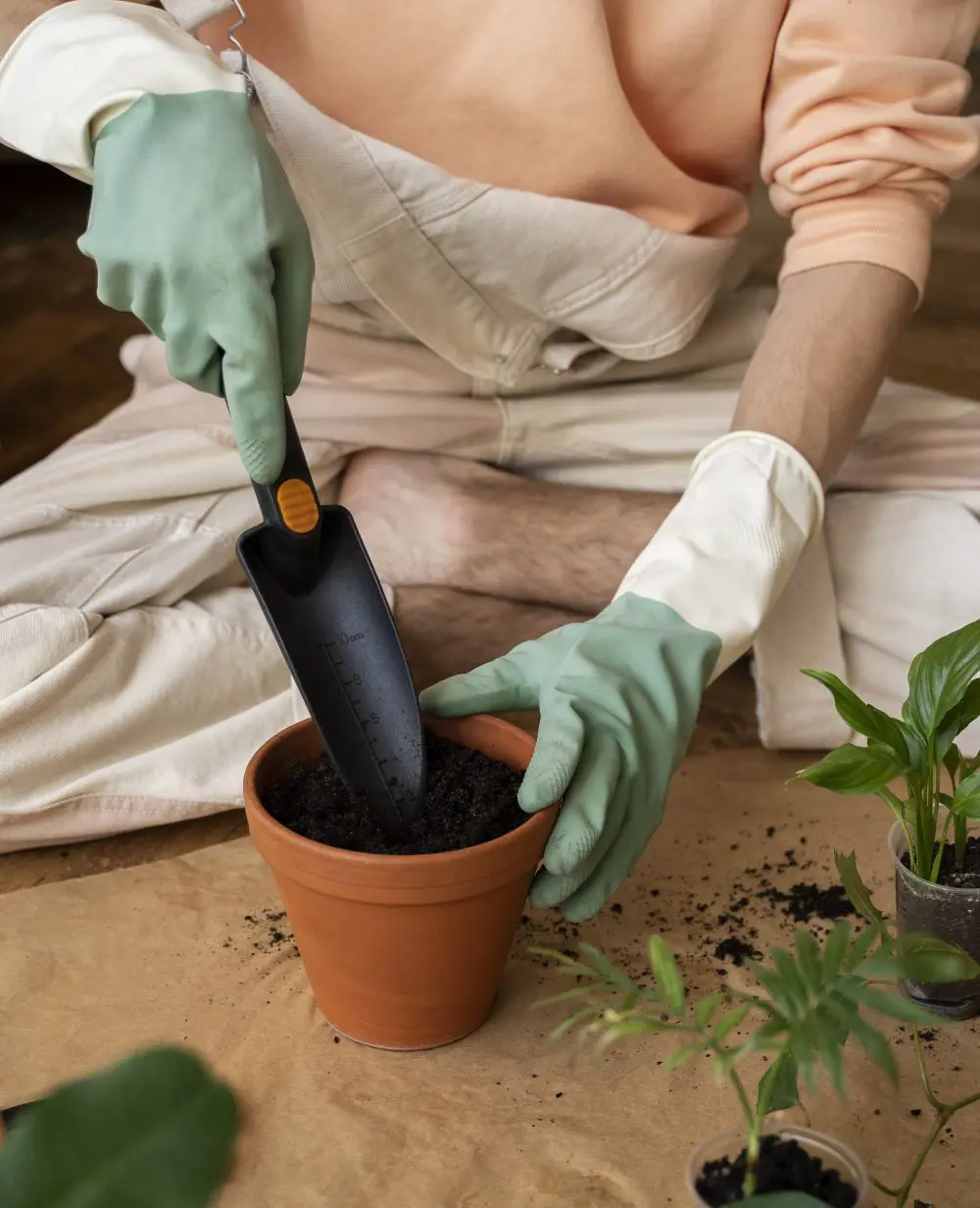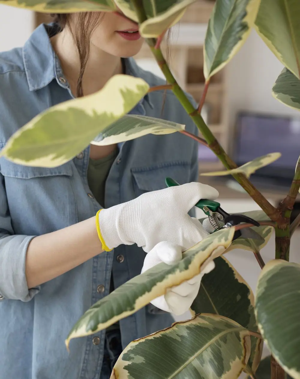 Always wear protective gloves while taking stem cuttings from a rubber tree because its sap can irritate the skin on contact and gather all the tools and materials before you start.