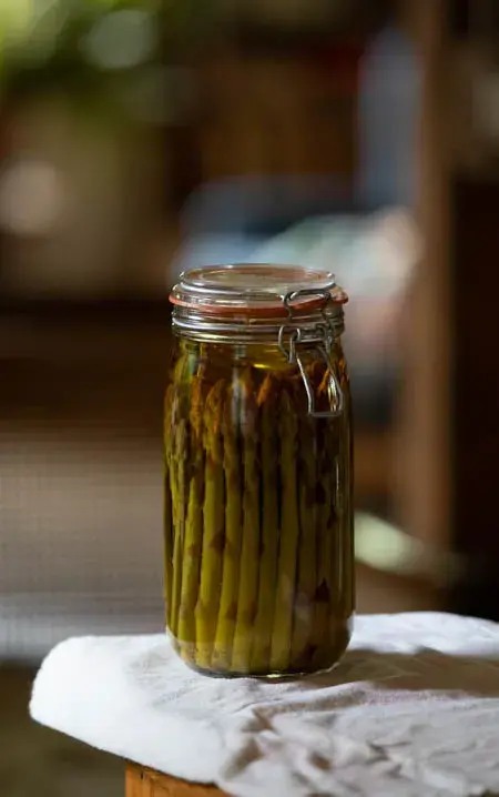 Pickling is a simple and tangy preservation method. Prepare a straightforward pickling solution by combining vinegar, water, salt, and sugar. Trim the asparagus spears to fit your container, submerge them in the pickling solution, and store the concoction in the fridge.
