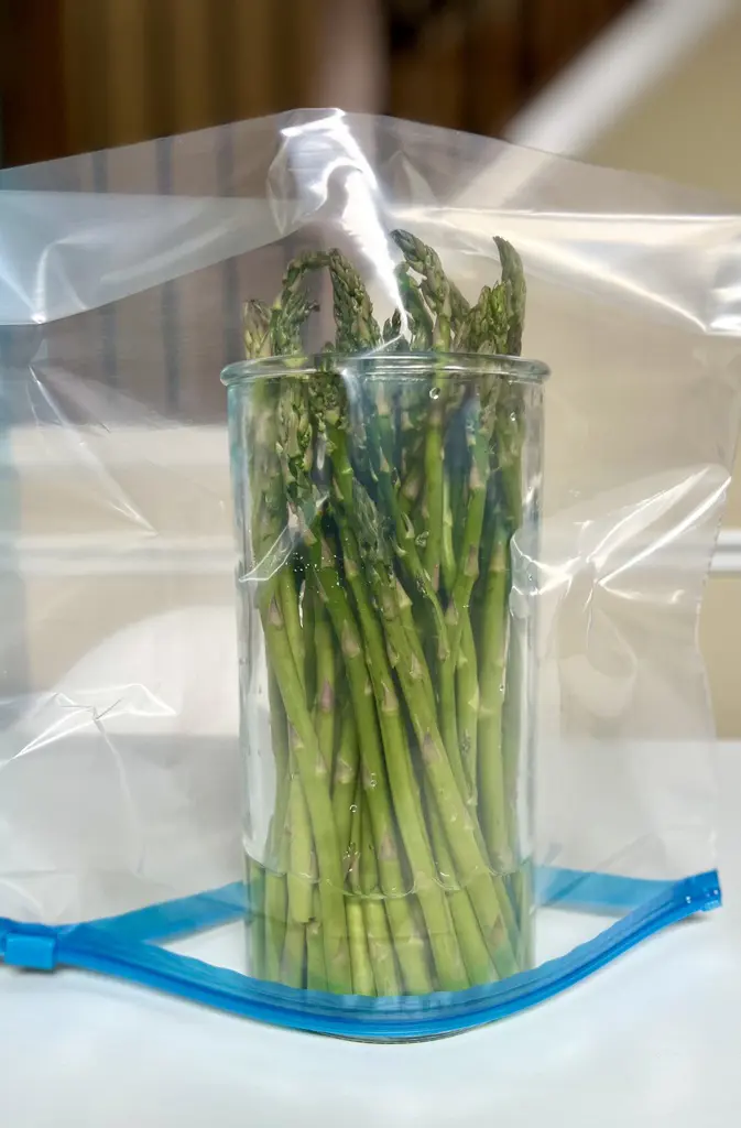 This makeshift greenhouse helps maintain humidity, preventing dehydration and keeping the asparagus fresh. Refrigerate the setup, changing the water every few days to ensure it stays clean and the asparagus remains crisp.