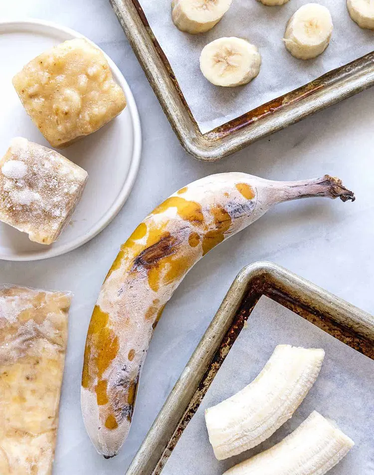 Store them in plastic bags or airtight containers to prevent freezer burns. Make sure to also label the date on the package in the freezer so you can consume them before they start going bland. Blend the frozen bananas as a deliciously sweet base for smoothies or turn them into banana ice cream.