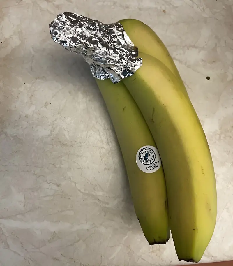 Ethylene gas which causes the ripening of bananas is released from the stems, so it makes sense to prevent ripening by covering the stems with plastic wrap or aluminum foil. This traps and prevents the release of ethylene gas and significantly slows down the ripening.