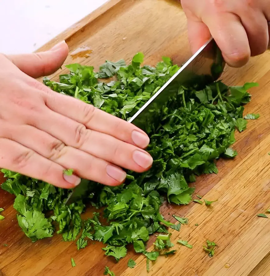 • Chop the Whole Bunch: Hold the bunch of cilantro by the stems. Position your knife at the desired height on the stems and make a straight cut. This includes both the leaves and the thinner stems. Suitable for recipes where the stems contribute to the flavor.