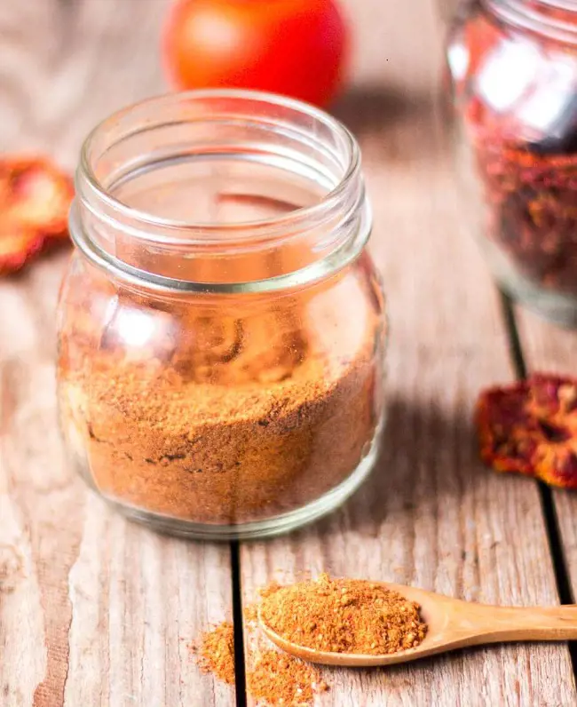 Tomato powder in a simple term is a dried tomato that has been finely ground into a seasoning powder. This powder form of tomatoes can be used to blend spices or dry rubs, or can also be used to flavor soup, stew, rice, and other dishes. Everything is similar to the drying process, after the tomatoes are properly dehydrated you just need to grind the final product and keep it safely in a glass jar.