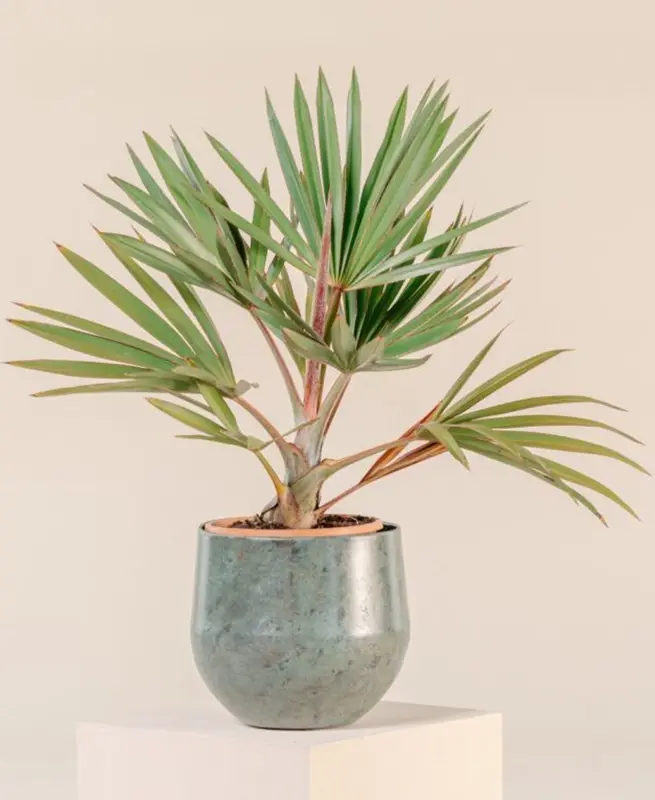 The Latania Palm is a striking and unique indoor palm known for its large, fan-shaped fronds and distinctive, colorful petioles. Native to the Mascarene Islands, this palm can grow up to 6 feet tall indoors.