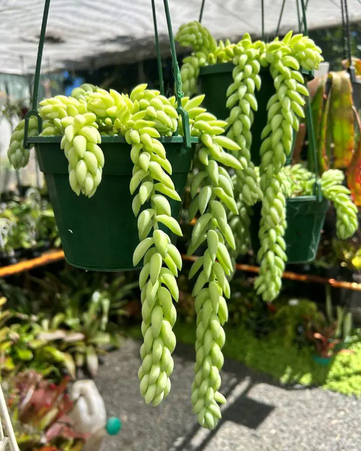 The leaves are densely packed along the trailing stems, creating a cascading effect that adds texture and interest to any indoor or outdoor space. Donkey Tail Succulent is a popular choice for hanging baskets, containers, or as a ground cover in succulent gardens.