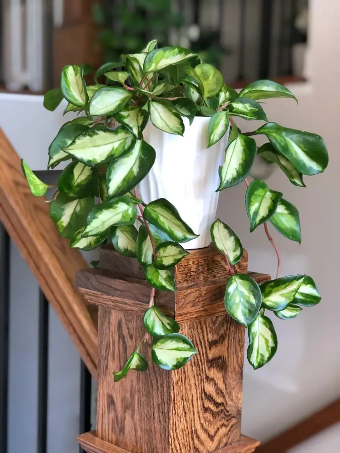 Hoya carnosa, commonly known as the hoya or wax plant, is a popular indoor vine appreciated for its waxy, succulent-like leaves and clusters of star-shaped flowers. The leaves are typically green, but variegated cultivars with white or cream-colored margins are also available. It is a slow-growing plant, but it's known for its longevity and can live for many years with proper care.