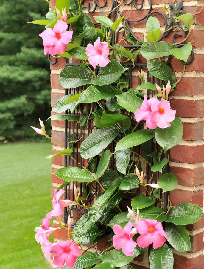 The flowers come in various colors, including shades of pink, red, and white, adding a touch of tropical elegance to any space. The vines of Mandevilla can grow vigorously, climbing upwards with the support of a trellis or other structure.