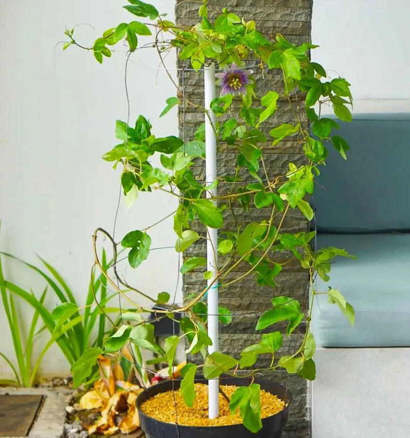 Passion Flower vines are vigorous climbers, with tendrils that help them cling to supports as they grow. The leaves are typically deep green and palmately lobed.
