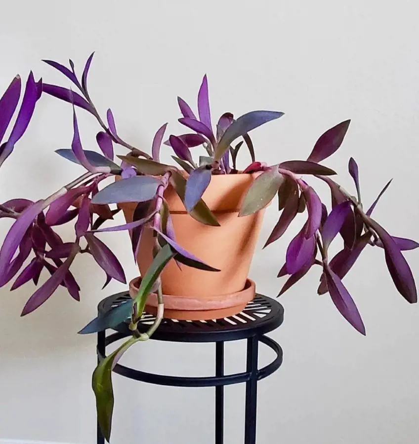 Purple Heart is a stunning trailing plant admired for its vibrant purple foliage. The leaves are lance-shaped, elongated, and densely packed along the cascading stems, creating a lush and colorful display.