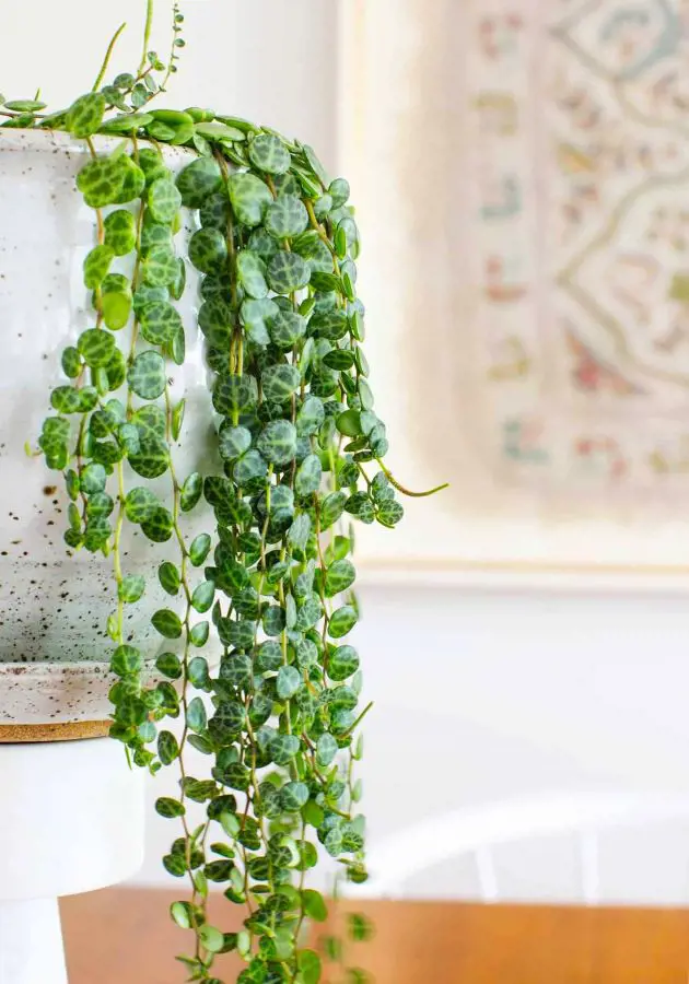 Indoor hanging vine plants, the String of Pearls is the quirky artist of the vine world, with its spherical leaves resembling a string of delicate beads. It's a whimsical addition to any room, trailing gracefully from hanging baskets or cascading over shelves like a living work of art.