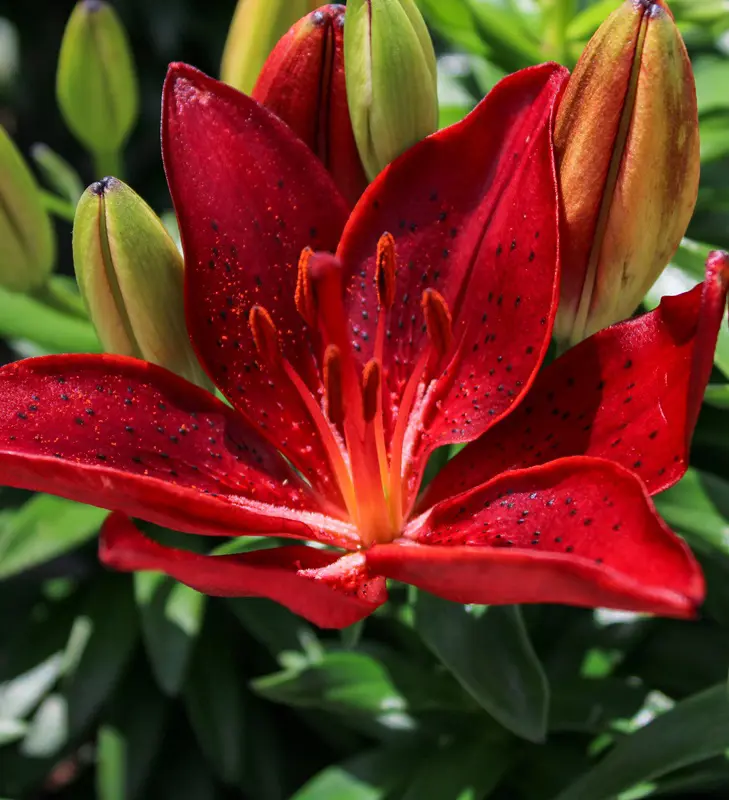There are about 80-100 species of Lily in the world, found under the Liliaceae family. These flowers produce exotic blooms with trumpet-style looks. With hybridization becoming popular today, many lilies require less maintenance compared to natural ones. contain red petals and