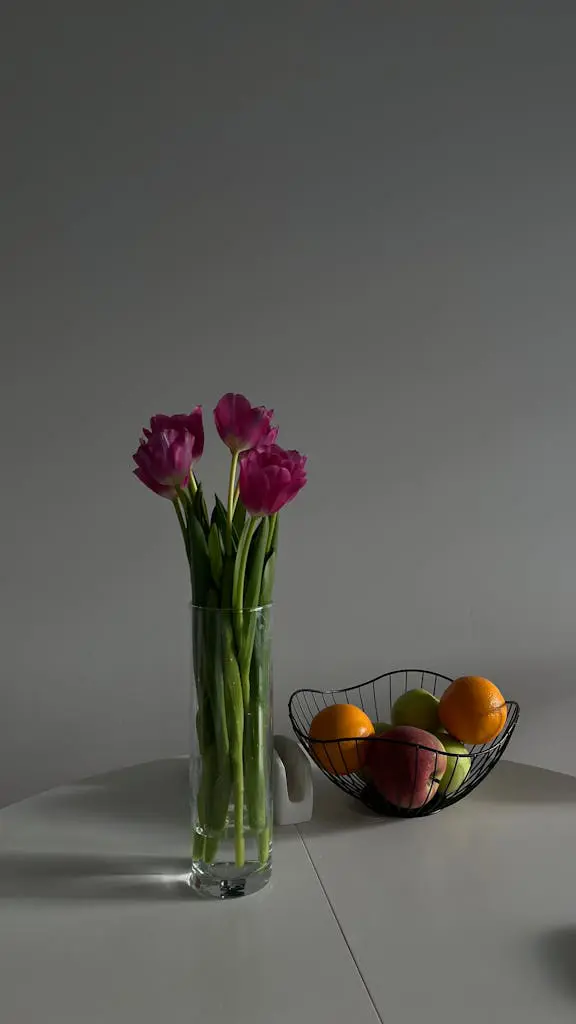 When flowers get exposed to ethylene from nearby fruits, it makes the flowers make their own ethylene too. And that ethylene gas makes the flowers shrivel up and wilt much faster than normal. So if you want your flowers to live a nice long life in the vase, never put fruits anywhere close by.