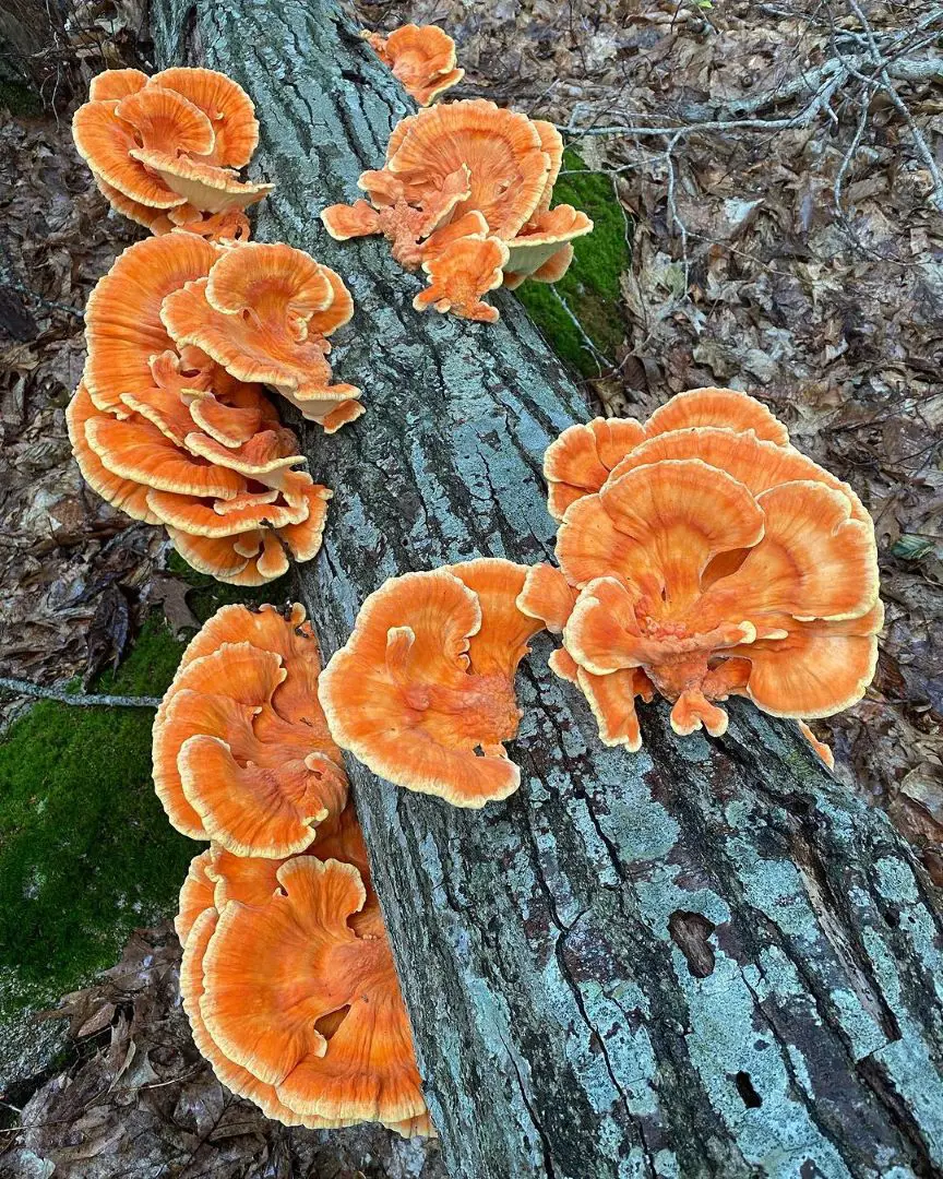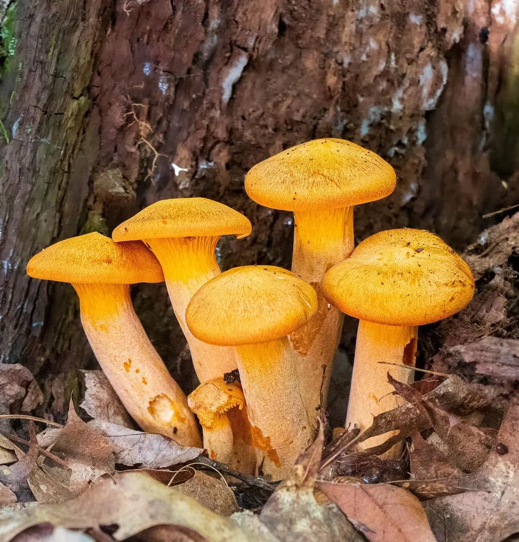 The Jack O'Lantern is a big, bright orange-colored mushroom often seen around the base of hardwood trees. They look similar to Chanterelle and Chicken in the Woods mushrooms. You can differentiate Jack O'Lantern by their fleshy appearance and ability to grow in larger clumps.