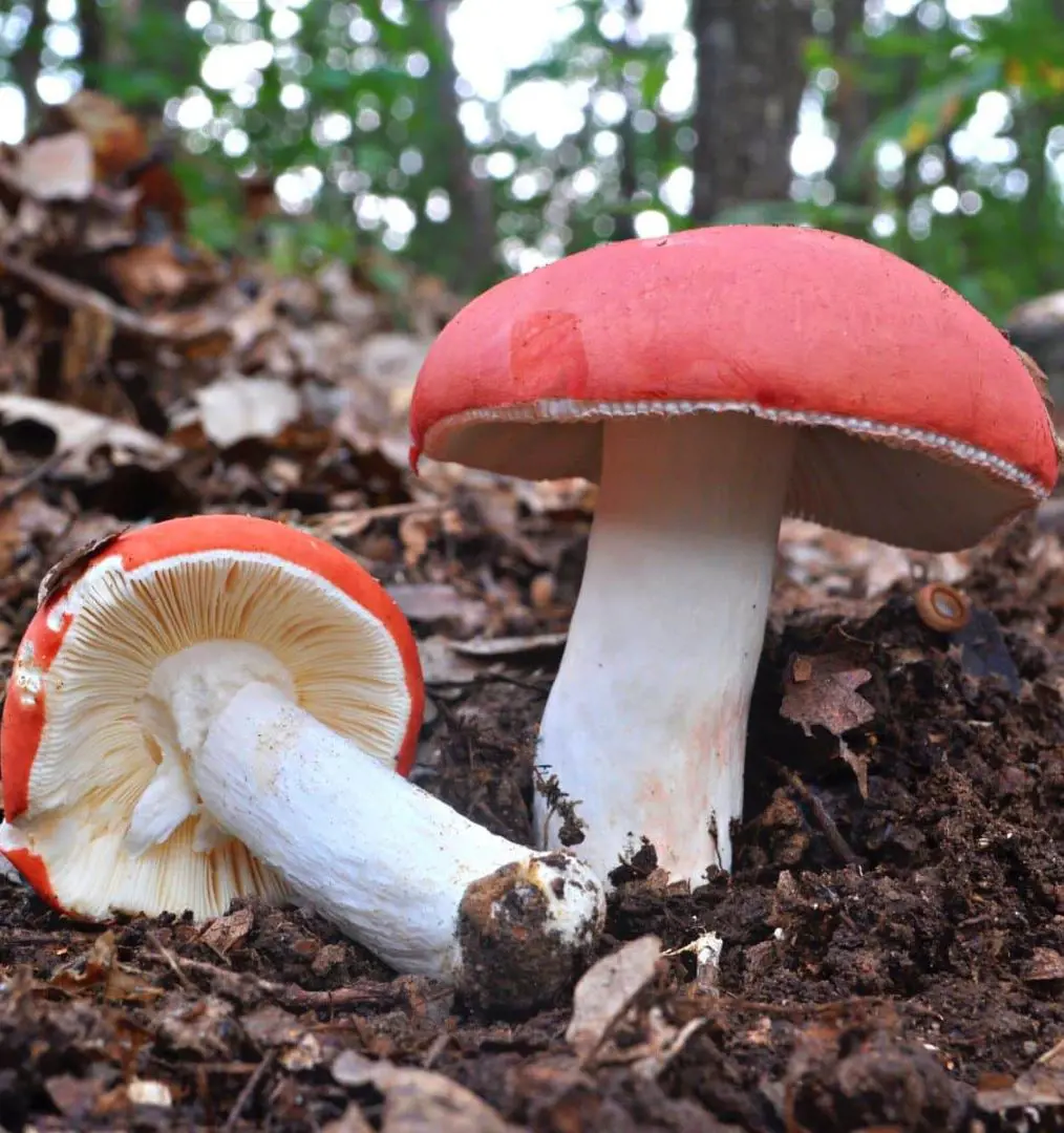 The upper part of the cap is deep red with white gills and stems. These mushrooms are often overlooked due to their poor quality compared to other admired mushrooms.