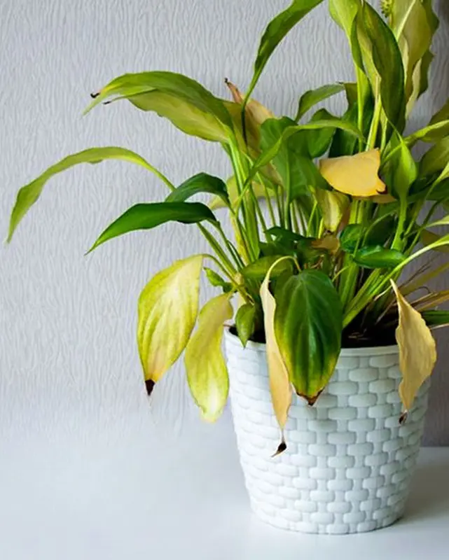 Many reasons such as over-watering, underwatering and drainage problems cause peace lily leaves to turn yellow and droop.