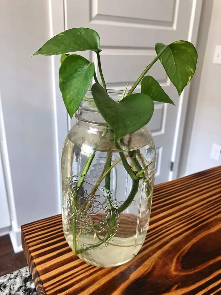 We can propagate pothos by cutting the stem. Cut around 6 inches of healthy steam from growing pothos by removing the leaf at the end. Keep the cutting stem in the glass filled with water in bright, indirect sunlight for several days. When the proper root is developed, pot the rooted cutting in the container which contains well-draining soil.