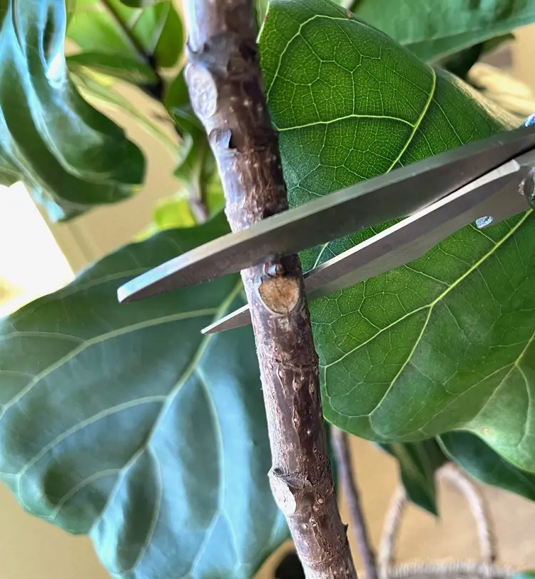 Take your scissors or pruning shears and carefully cut the chosen branch. Make the cut right underneath a leaf on the stem. Imagine you're giving the plant a little trim just below where a leaf is attached. This point is called a leaf node.