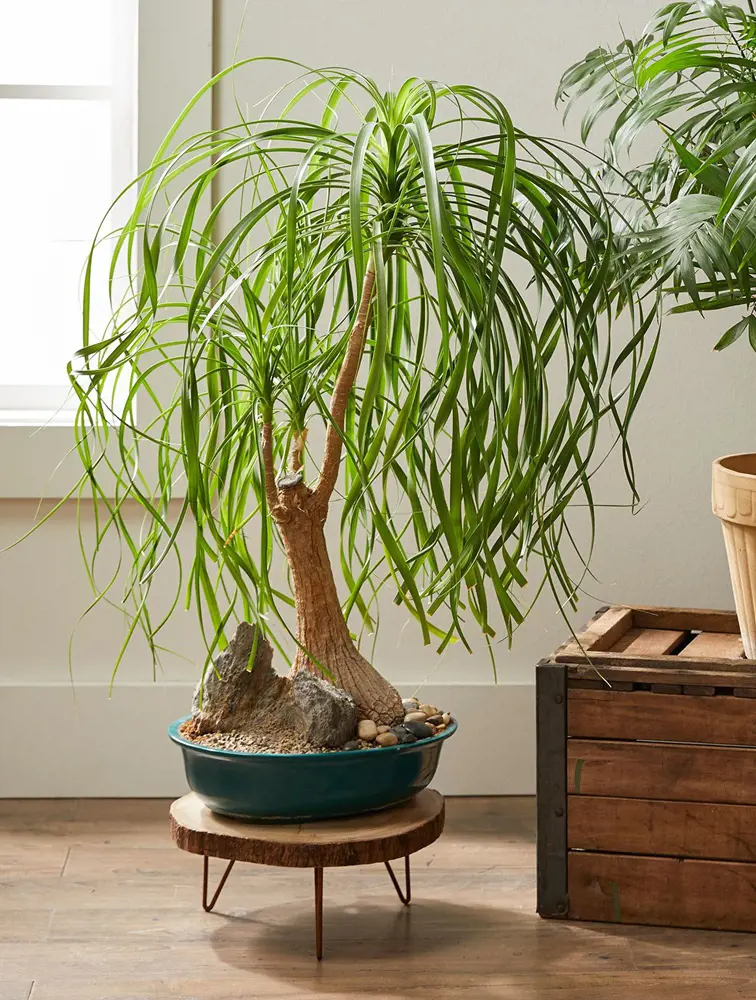 It thrives in bright, indirect light and can tolerate low humidity. Watering should be done sparingly, allowing the soil to dry out between waterings. With its appealing appearance and easy care routine, the Ponytail Palm is a great addition to any cat-friendly home.