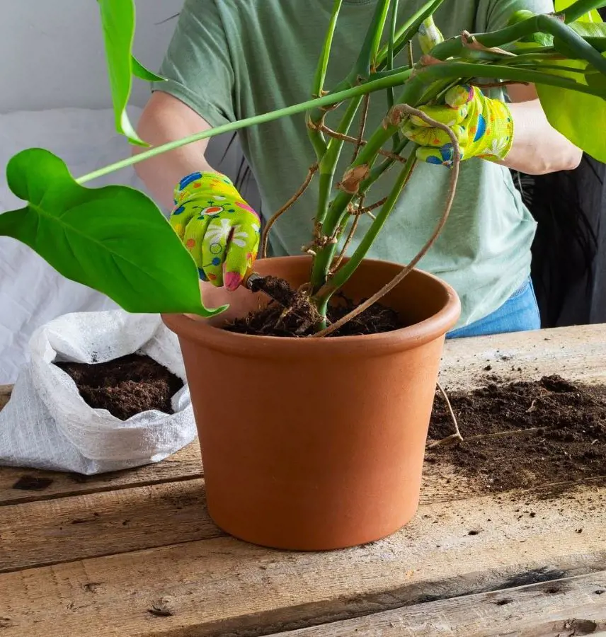 - Place a layer of fresh potting mix at the bottom of the new pot, then position the Monstera plant in the center.