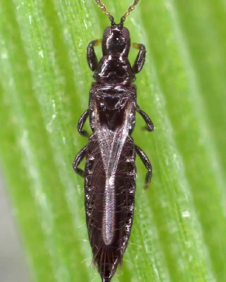 Thrips, also known as, Thysanoptera or thunderflies, are minute, slender insects about the size of a sewing needle. They are translucent and vary in color from yellow to brown or black, with soft bodies and asymmetrical mouthparts.