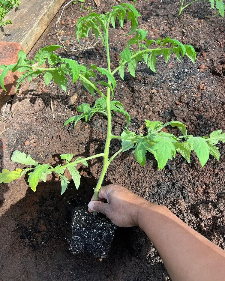 Tomatoes have this cool ability to develop roots along their buried stems, which actually helps them grow stronger and stay more stable. Now, gently remove the seedlings from their containers, being careful not to mess up their roots, and place them in the holes you prepared. Once they're in, pack the soil around the seedlings nicely and firmly to get rid of any pesky air pockets.