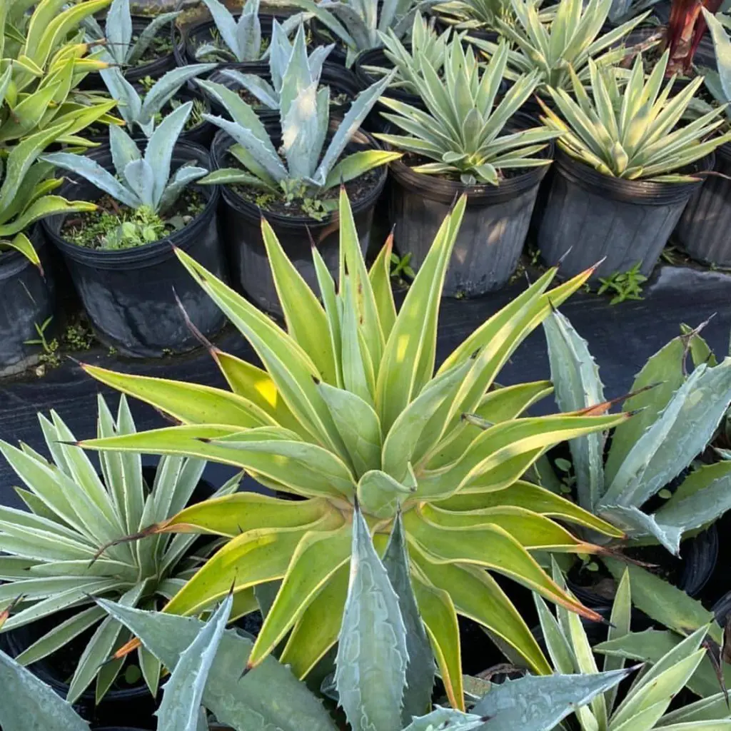 Agaves are succulents with large, thick leaves ending in sharp tips. There are over 250 agave species, ranging from massive 10-foot-tall plants to smaller dish-sized varieties. A few types have soft, spineless leaves. Agaves do best in rocky, sandy, well-draining soil in full sun locations.