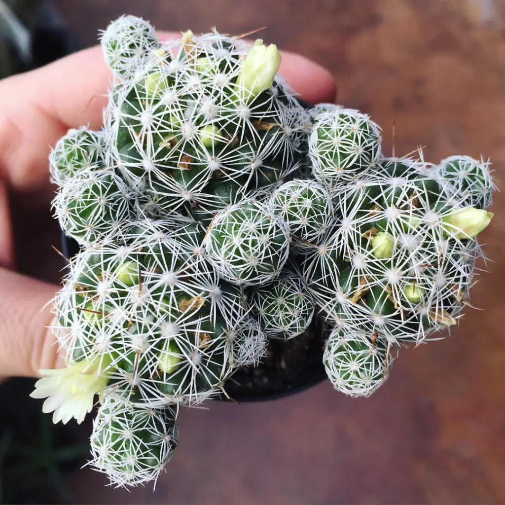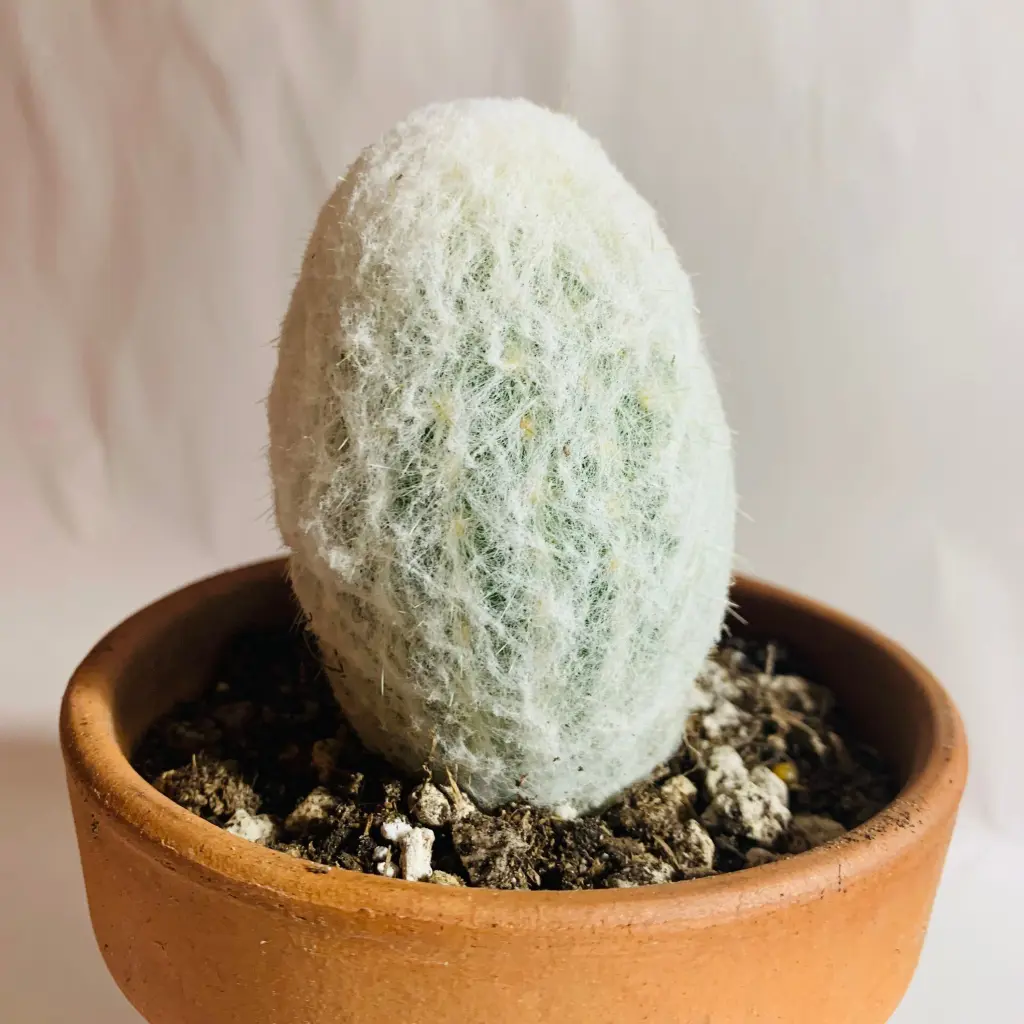 The Old Lady cactus is a succulent desert plant from the cactus family. It can make a unique decoration for your home or garden. This cactus has a round stem up to 3.5 inches (9cm) tall and wide. Its light green stem is covered in white fuzzy fluff.