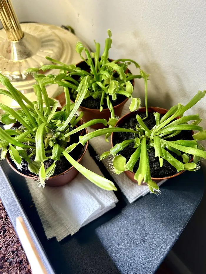 - Venus Fly Traps also require high humidity levels, so consider placing a tray of water near the plants.