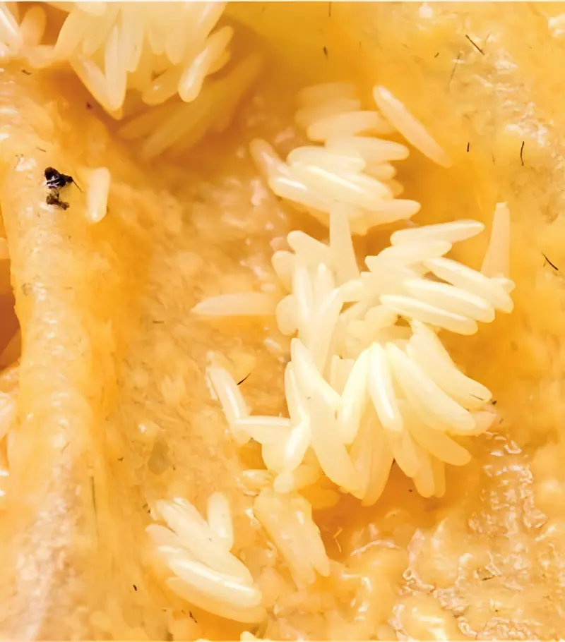 Fly eggs typically look like a small clumped cluster of small grains of rice. When you spot them, they could easily be mistaken for rice grains and could easily be crammed into any nook or crevice. The eggs will hatch within 24 hours. and house fly larvae emerge.