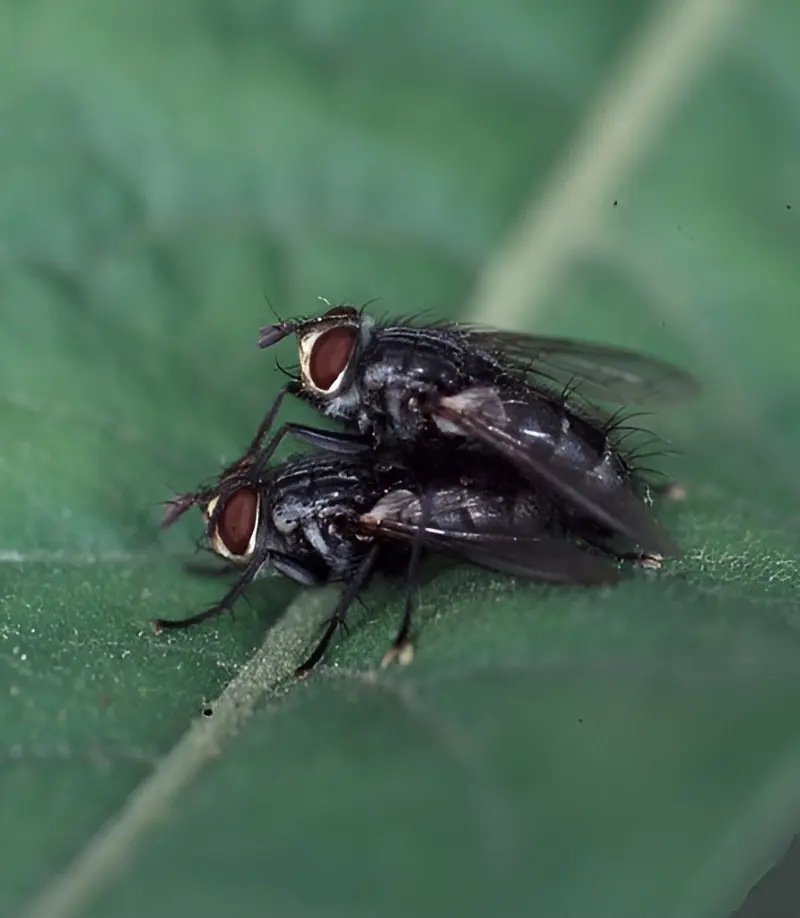 Aptly named, flesh flies feed and lay their eggs on carrion or scraps of meat on which to lay their eggs. Adult flesh flies are 3 times larger than a housefly with three dark stripes on the thorax.